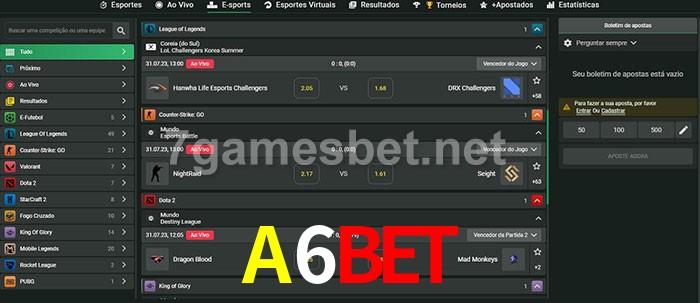 O A6Bet oferece uma grande seleção de opções de apostas em e-sports com probabilidades competitivas